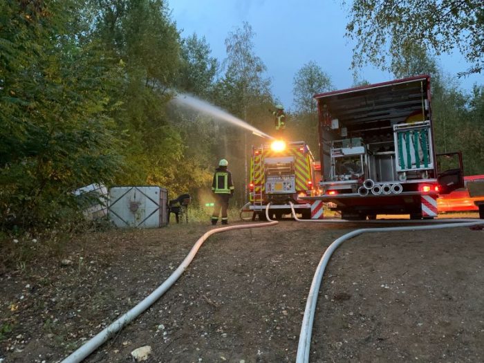 Durch die Explosion wurde ein Waldbrand ausgelöst der drohte auf ein Wohnhaus überzugreifen. Daher waren neben der Versorgung und Rettung der Person eine schnelle Brandbekämpfung und ein Aufbau einer Riegelstellung wichtig, um das Wohnhaus zu schützen und ein Feuerübersprung über die Straße zu verhindern. Die Wasserversorgung erfolgte aus einem etwa 150m entfernten Hydranten.