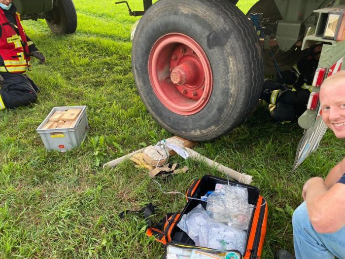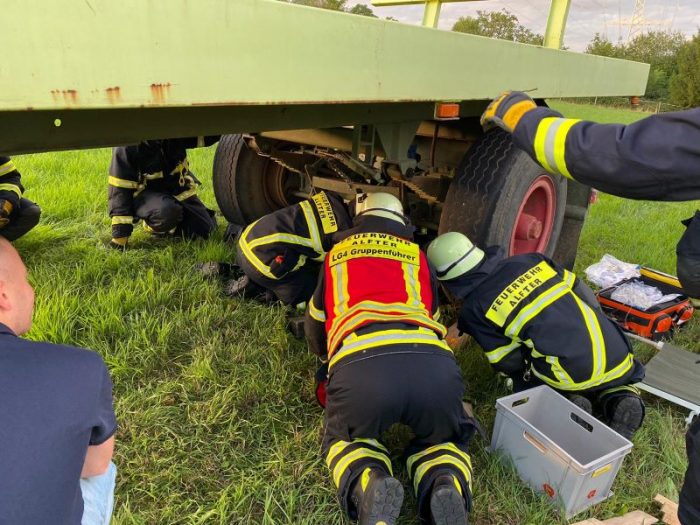Die Löschgruppe Impekoven vertiefte ihre Kenntnisse, ebenfalls in einer Kleingruppe, bei einer praktischen Übung. Bei diesem Übungsszenario wurde eine Person (dargestellt in Form einer Holzpuppe) von einem landwirtschaftlichen Anhänger überrollt und musste gerettet werden. Mit Hilfe diverser Gerätschaften gelangen den Übungsteilnehmern die Erste Hilfe Maßnahmen am Patienten und eine schonende Rettung.